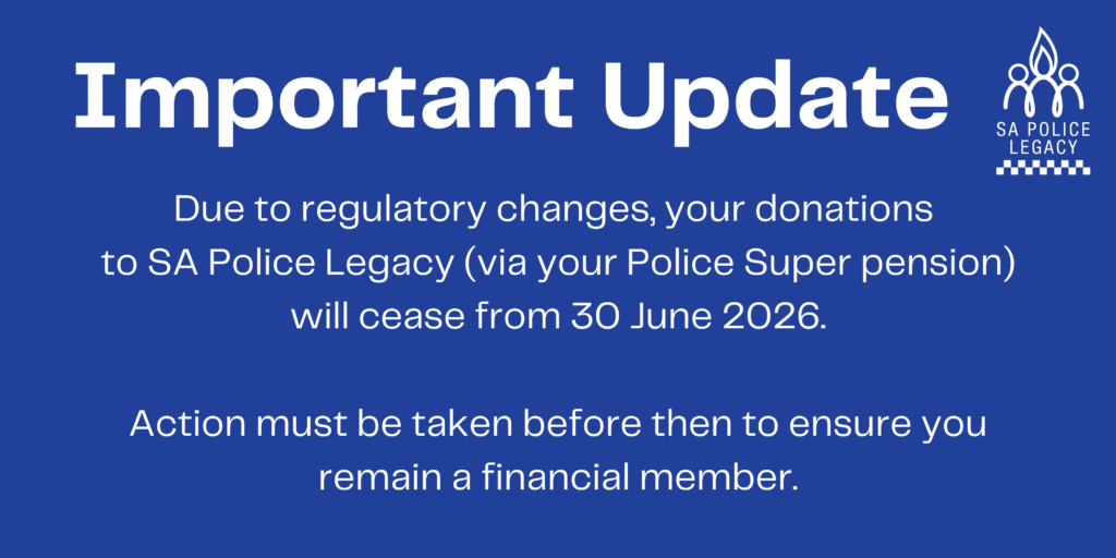 Due to regulatory changes, Police Super will no longer be able to facilitate donations after 30 June 2026. As a result, your donations currently made to SA Police Legacy through pension payments will cease from that date.