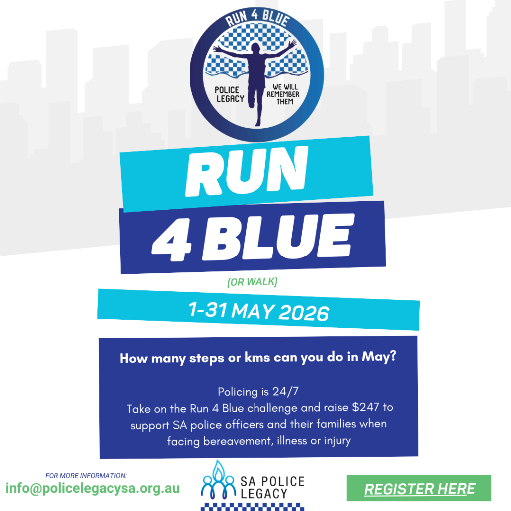 Run4Blue is a national movement supporting Police Legacy organisations across Australia. Whether you walk, run, ride or roll, every kilometre and every dollar raised helps us continue supporting South Australian police officers and their families through loss, illness and times of need.
